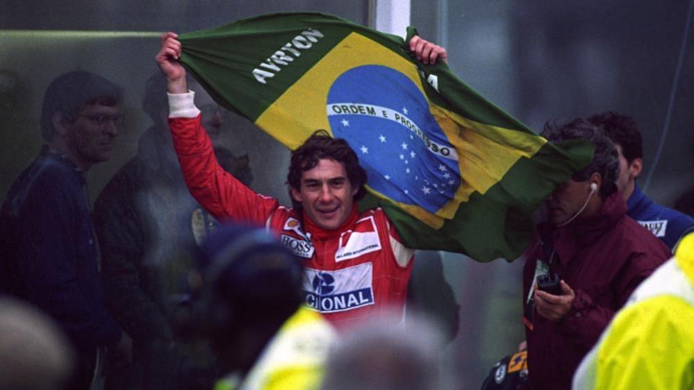 O nosso Ayrton Senna da Silva, brasileiro, nascido na zona norte de São Paulo, que também batalhou muito pra chegar até ali, deu tudo de si para conquistar seus três títulos mundiais, que era respeitado mesmo pelos rivais, o homem que se tornou lenda. Que foi capaz de ganhar seu primeiro GP em casa, mesmo com o câmbio travado, que merecidamente foi chamado de Rei da Chuva.