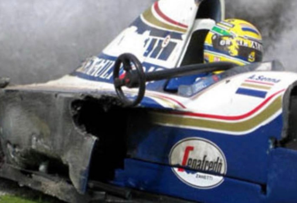 Ao entrar na perigosa curva Tamburello, a coluna de direção do carro de Ayrton se parte, ele perde o controle, chocando-se, de forma violenta contra o muro.