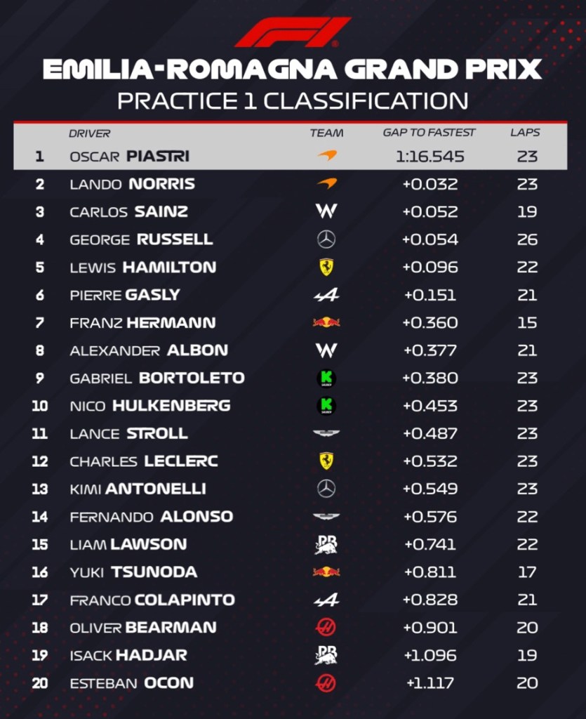 A FP1 foi liderada pelo piloto australiano Oscar Piastri.