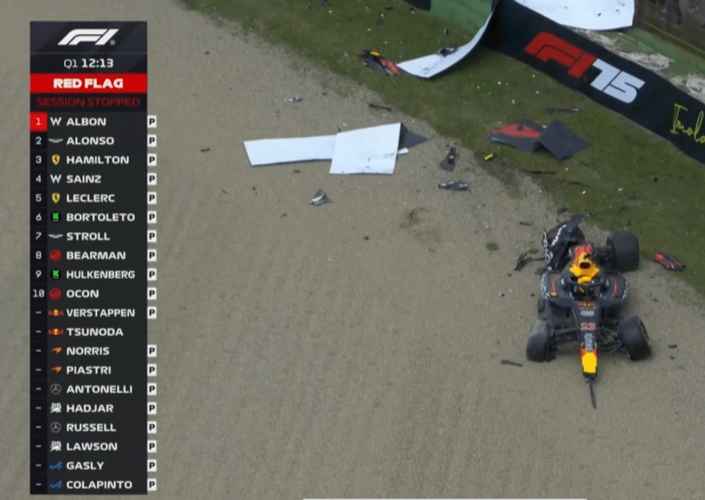 Logo no início do Q1, Yuki Tsunoda bate muito forte e aciona a REDFLAG. O carro capotou, foi uma cena de filme de terror. Mas no final o japonês saiu ileso.