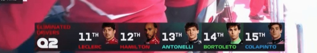 O que chamou atenção é que ambas as Ferraris não marcaram bons tempos e foram eliminados no Q2. Enquanto as duas Aston Martin e a Alpine do Gasly passaram para o Q3.