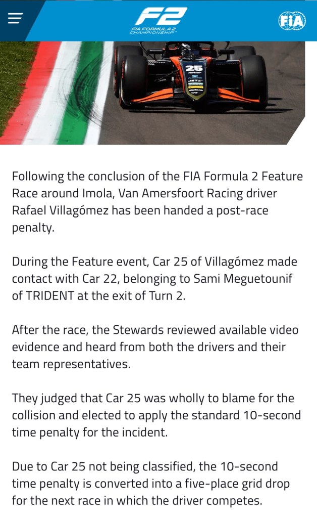 Após a corrida, o site da F2 liberou uma nota informando que o piloto Rafael Villagoméz sofreu um penalty por conta do acidente envolvendo Sami Meguetounif.