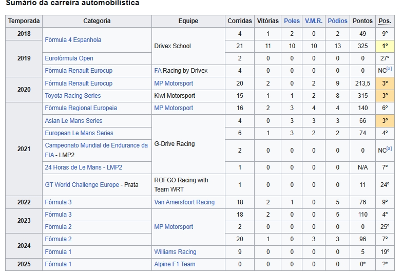 Em um comparativo com Alex Albon (seu team mate da Williams) durante essas 9 corridas, Franco teve a mesma quantidade de DNFs e marcou apenas 3 pontos a menos.